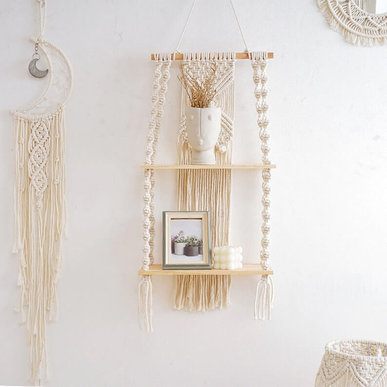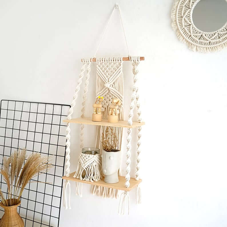 Boho wall decor Hanging Plant Shelves, Farmhouse Wooden Shelve