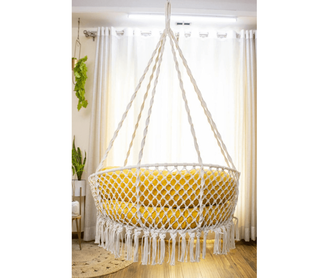This macrame swing is a stylish and cozy addition to any room’s decor.