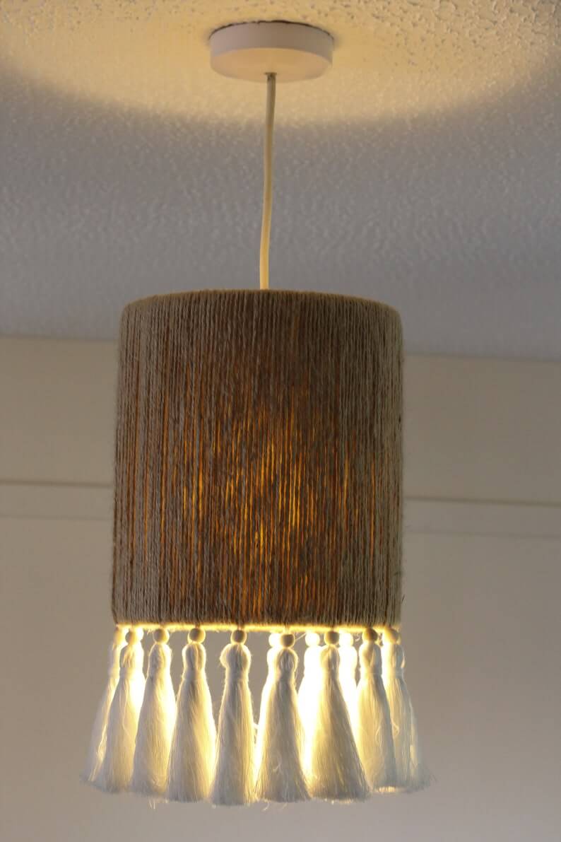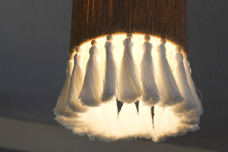 It is hand-made with a brown natural jute twine rope (2-3mm) and decorated with white recycled macrame tassels.